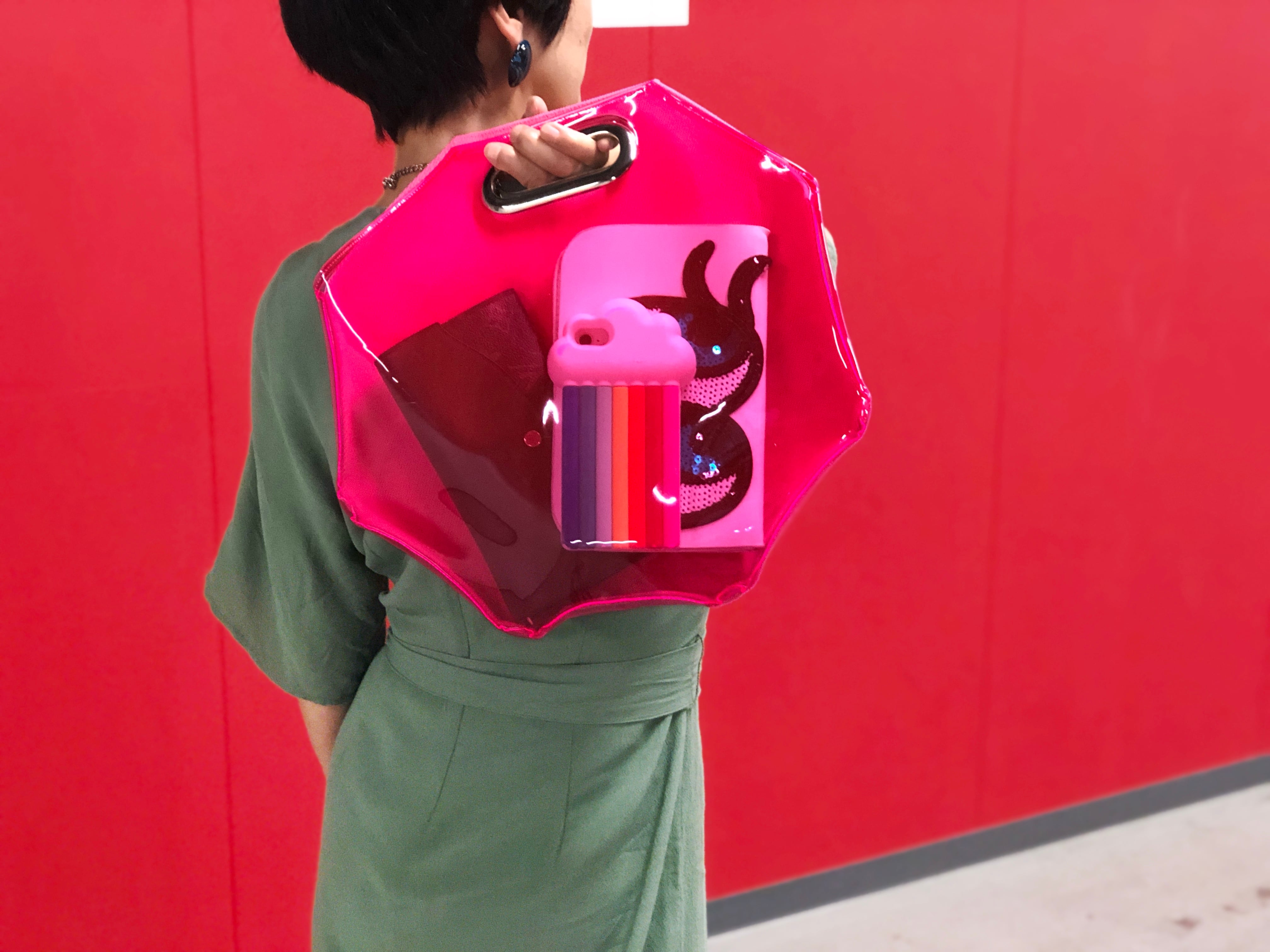 フロントのPVCシートはピンクの0.5mm厚を使用。適度な透明感がバッグ内側のピンクの帆布と混ざり合いビビットなカラーリングになります。
