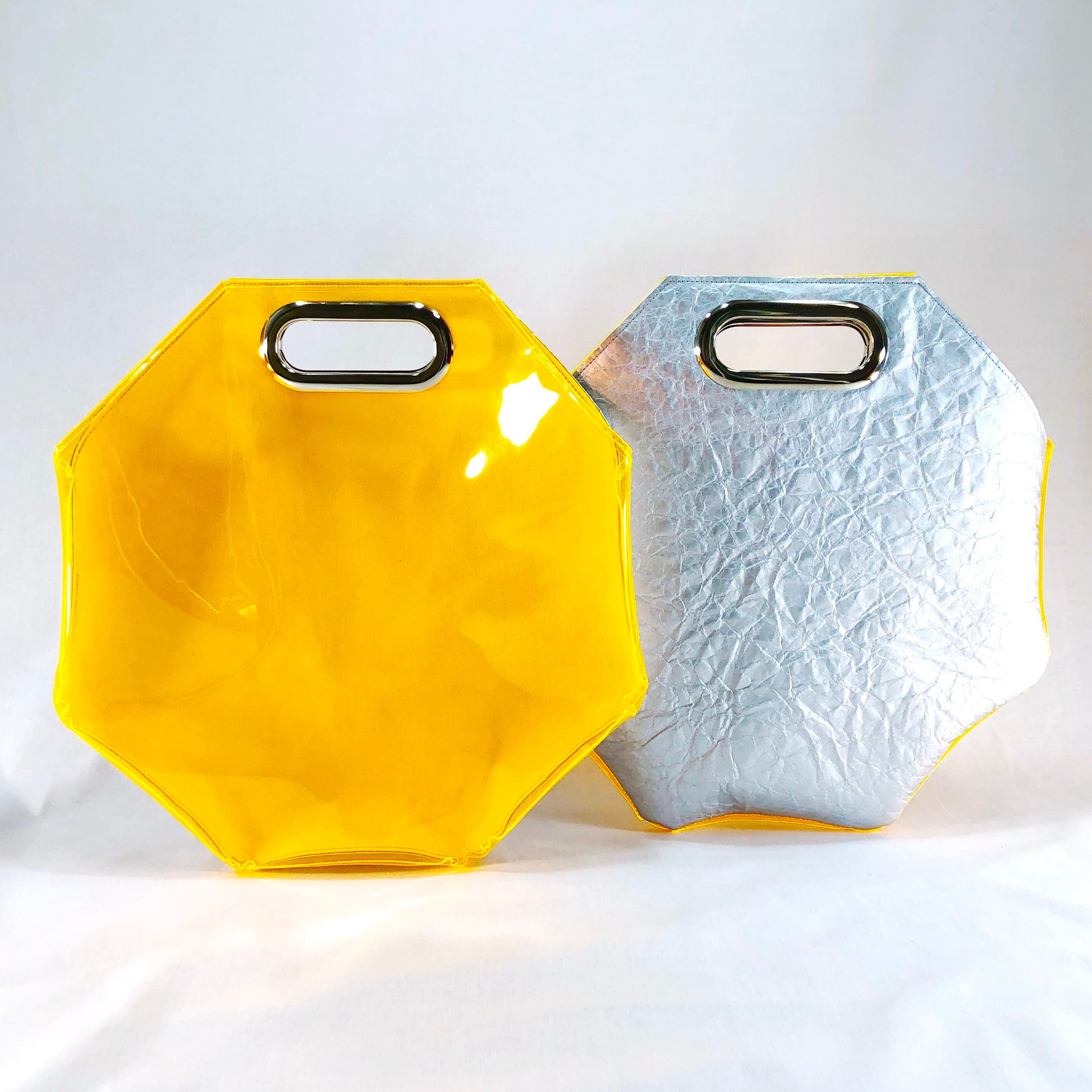 フロントのPVCシートはイエローの0.5mm厚を使用。適度な透明感がバッグ内側のイエローの帆布と混ざり合いビビットなカラーリングになります。
