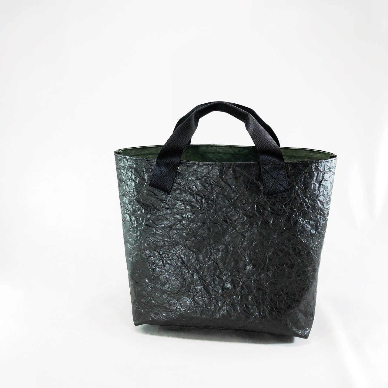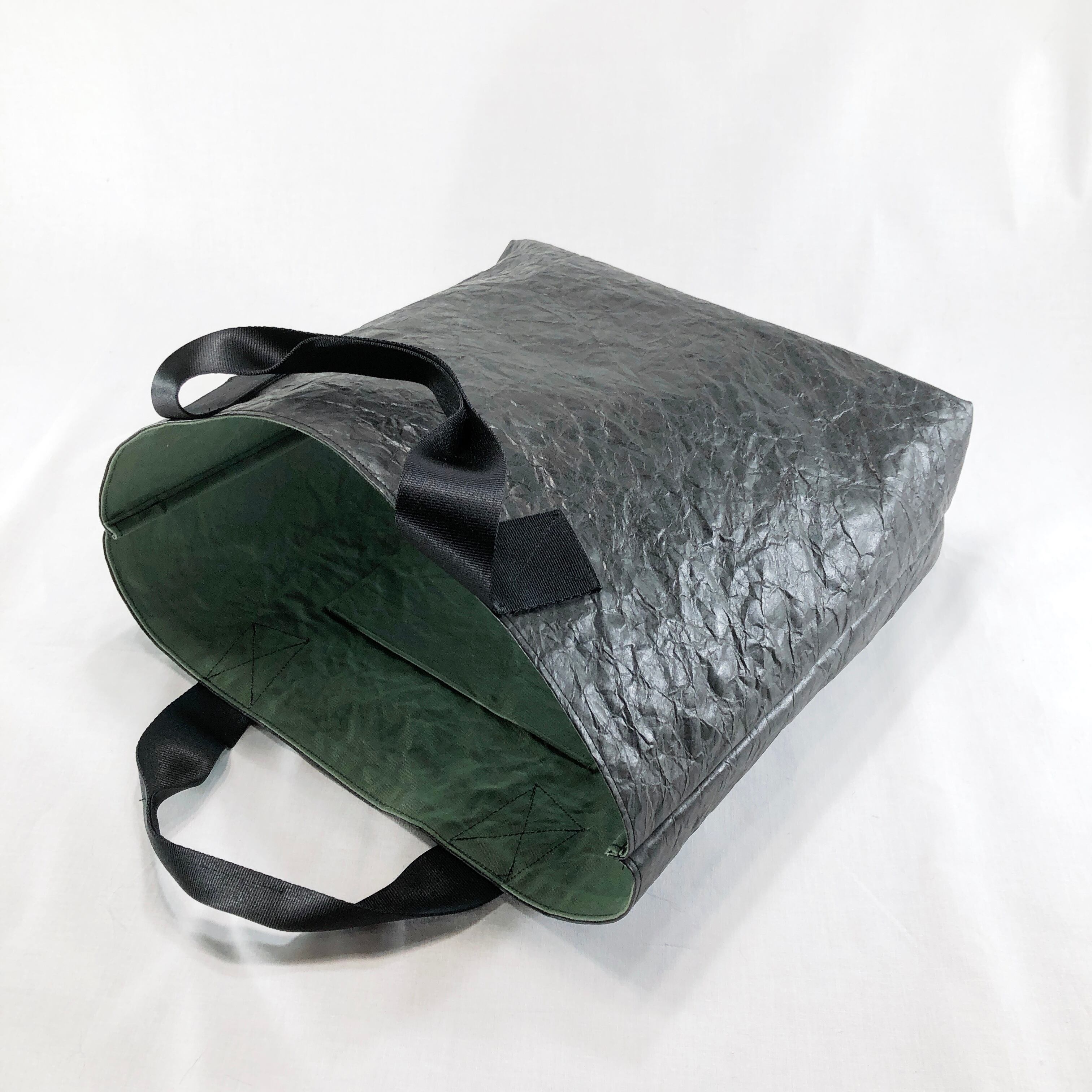 シワ加工したブラックタイベックに、ややウォッシュがかったオリーブ(モスグリーン)の肌触りの良い厚手生地を張り合わせ、持ち手は朱子織高級ナイロンテープを使用したカジュアル過ぎない大人トート。とても軽量で毎日使いたくなるバッグです。