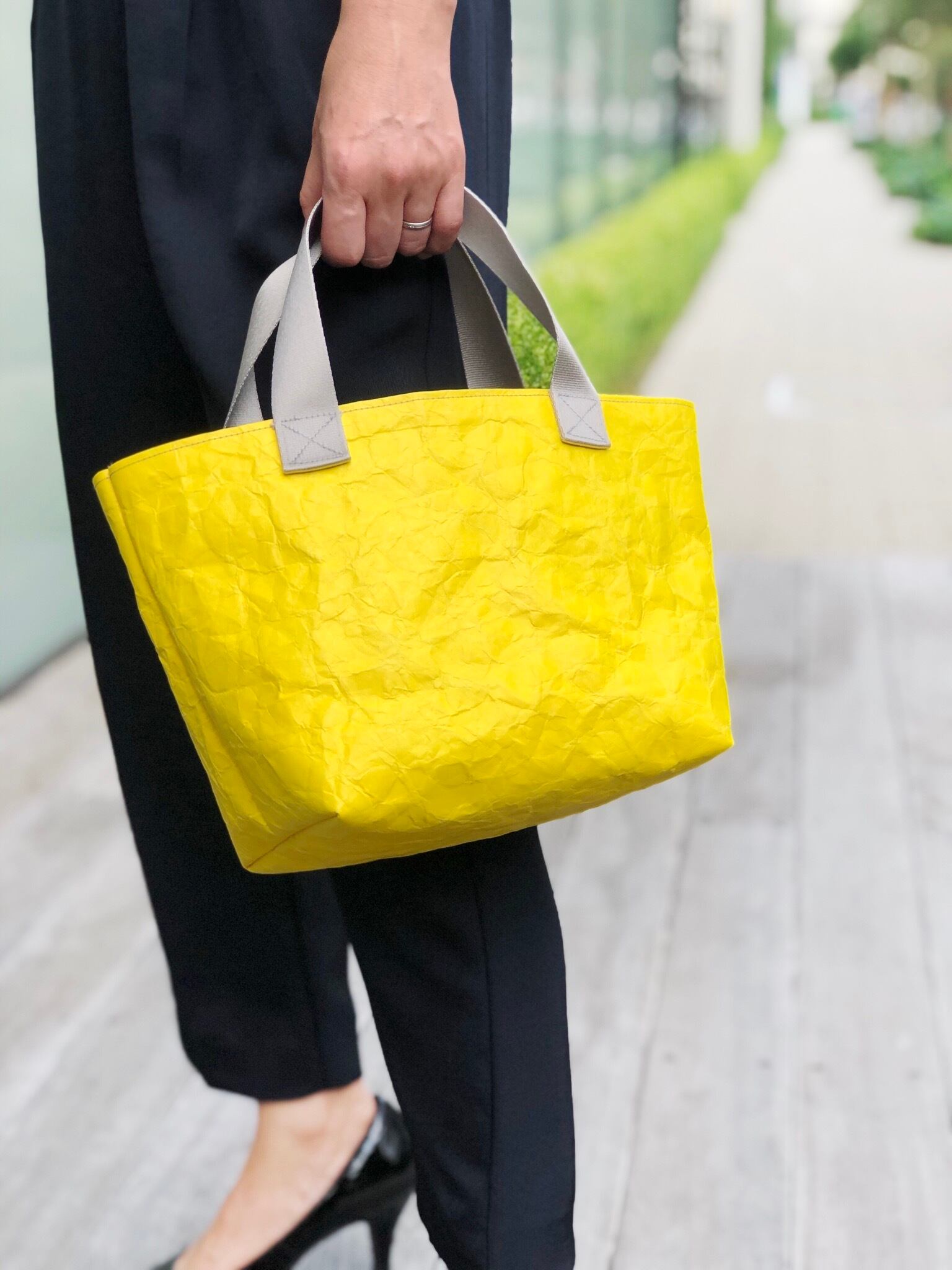 シワ加工した鮮やかなイエローのタイベックに今年のトレンドでもあるカラフルなボタニカル柄のコットン生地を張り合わせ、持ち手は朱子織高級ナイロンテープを使用した大人カジュアルなミニトート。とても軽量で毎日使いたくなるバッグです。