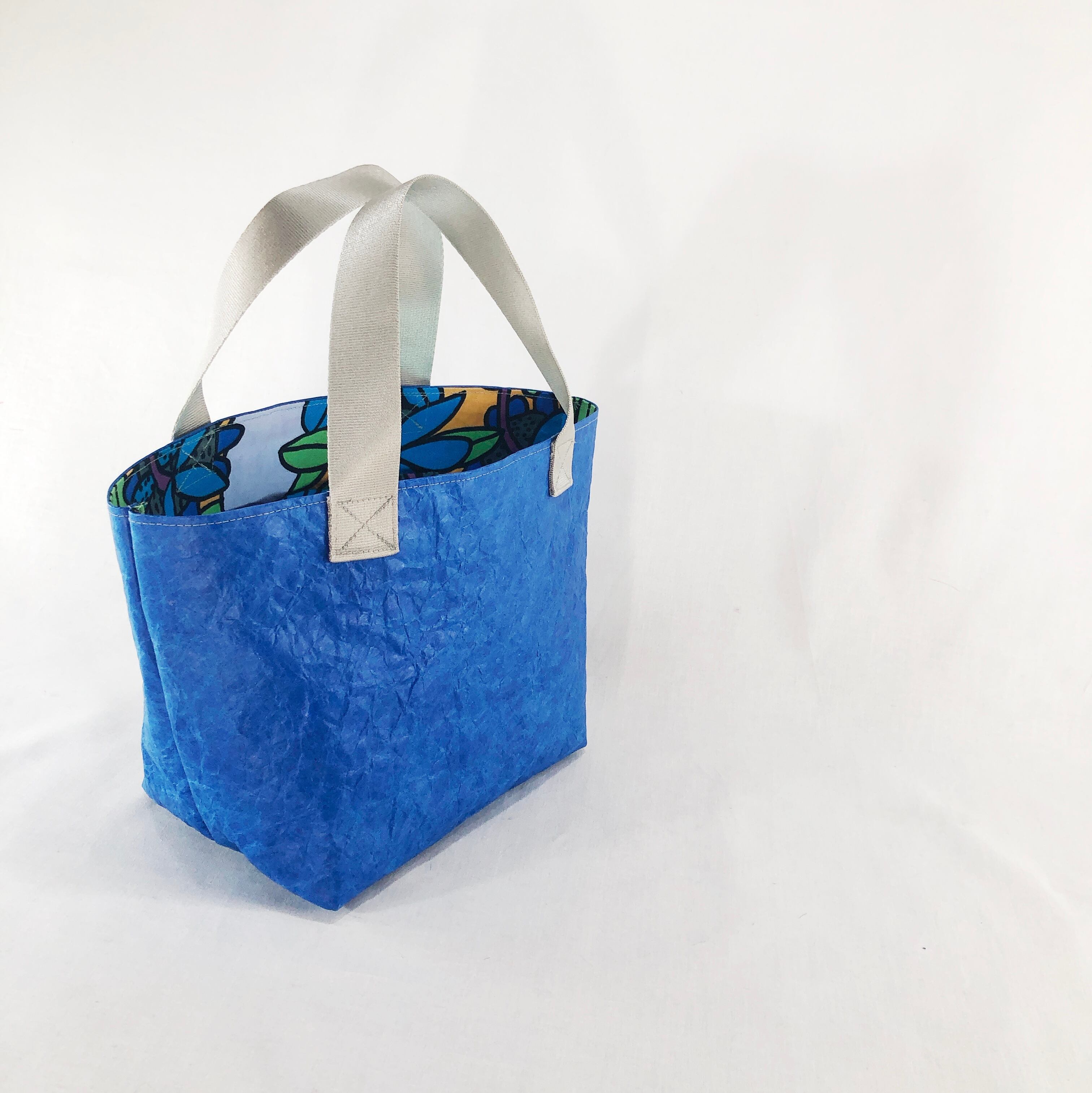 シワ加工した鮮やかなブルーのタイベックに今年のトレンドでもあるカラフルなボタニカル柄のコットン生地を張り合わせ、持ち手は朱子織高級ナイロンテープを使用した大人カジュアルなミニトート。とても軽量で毎日使いたくなるバッグです。