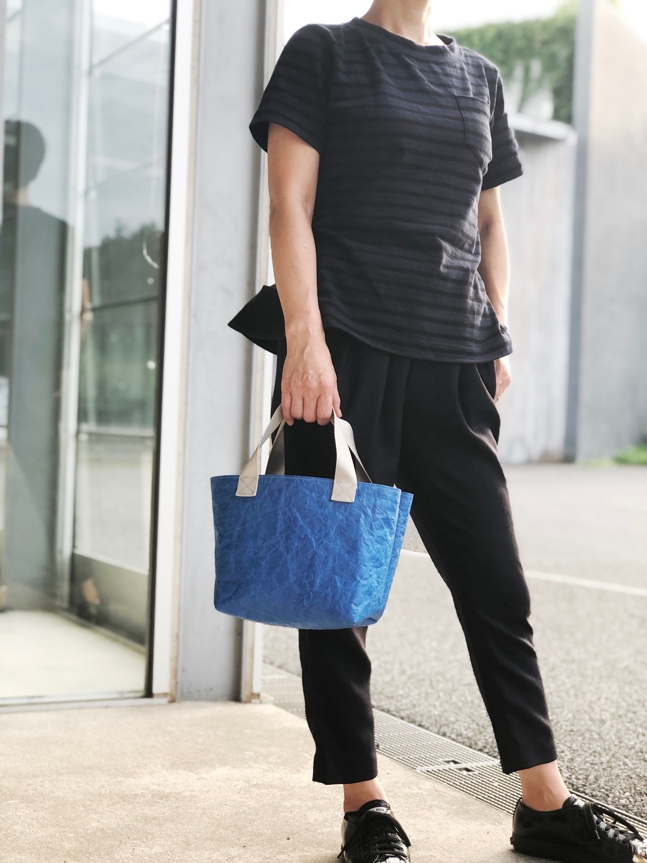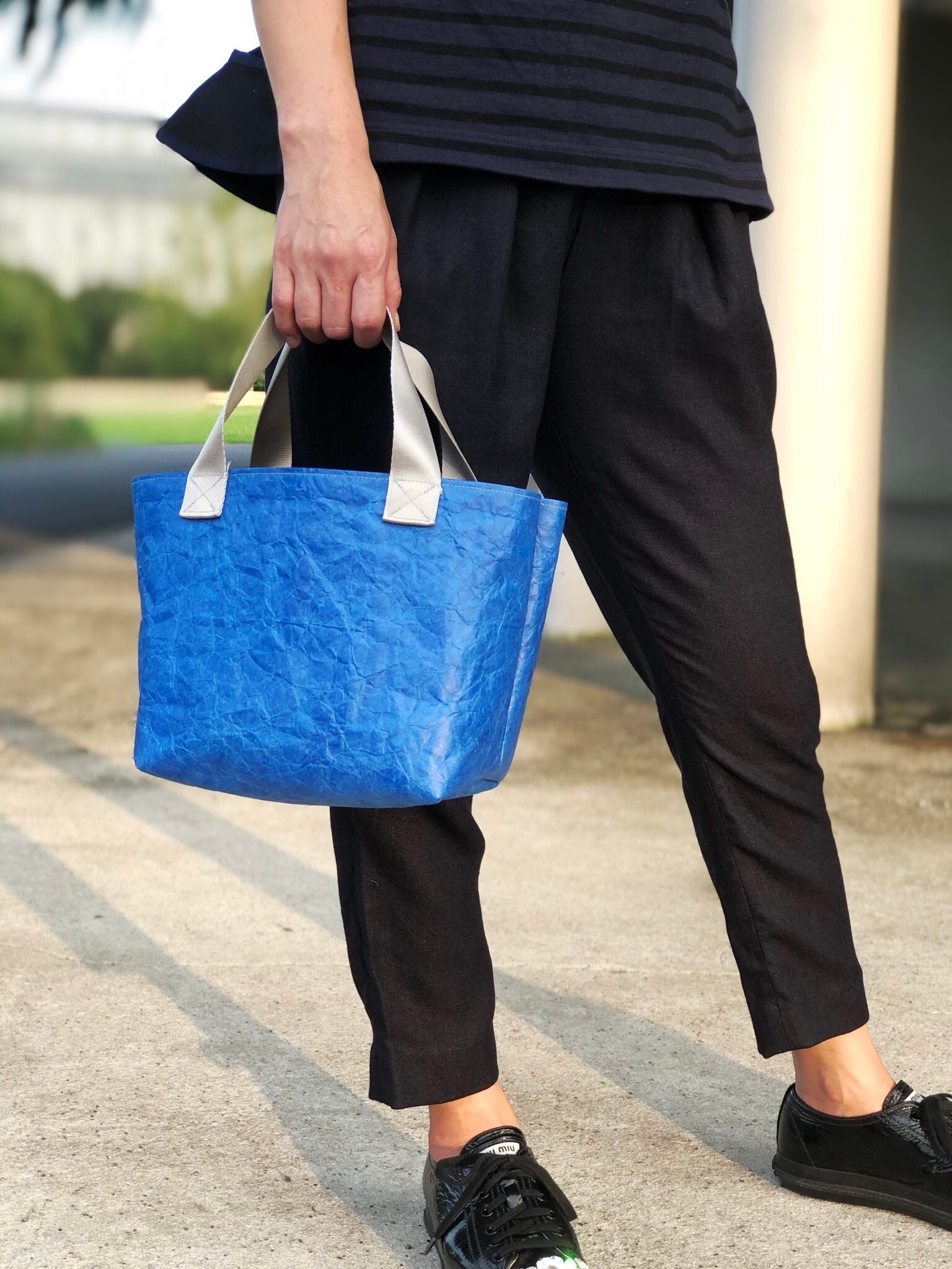シワ加工した鮮やかなブルーのタイベックに光沢を抑えたシルバーのフェイクレザーを張り合わせ、持ち手は朱子織高級ナイロンテープを使用した大人カジュアルなミニトート。とても軽量で毎日使いたくなるバッグです。