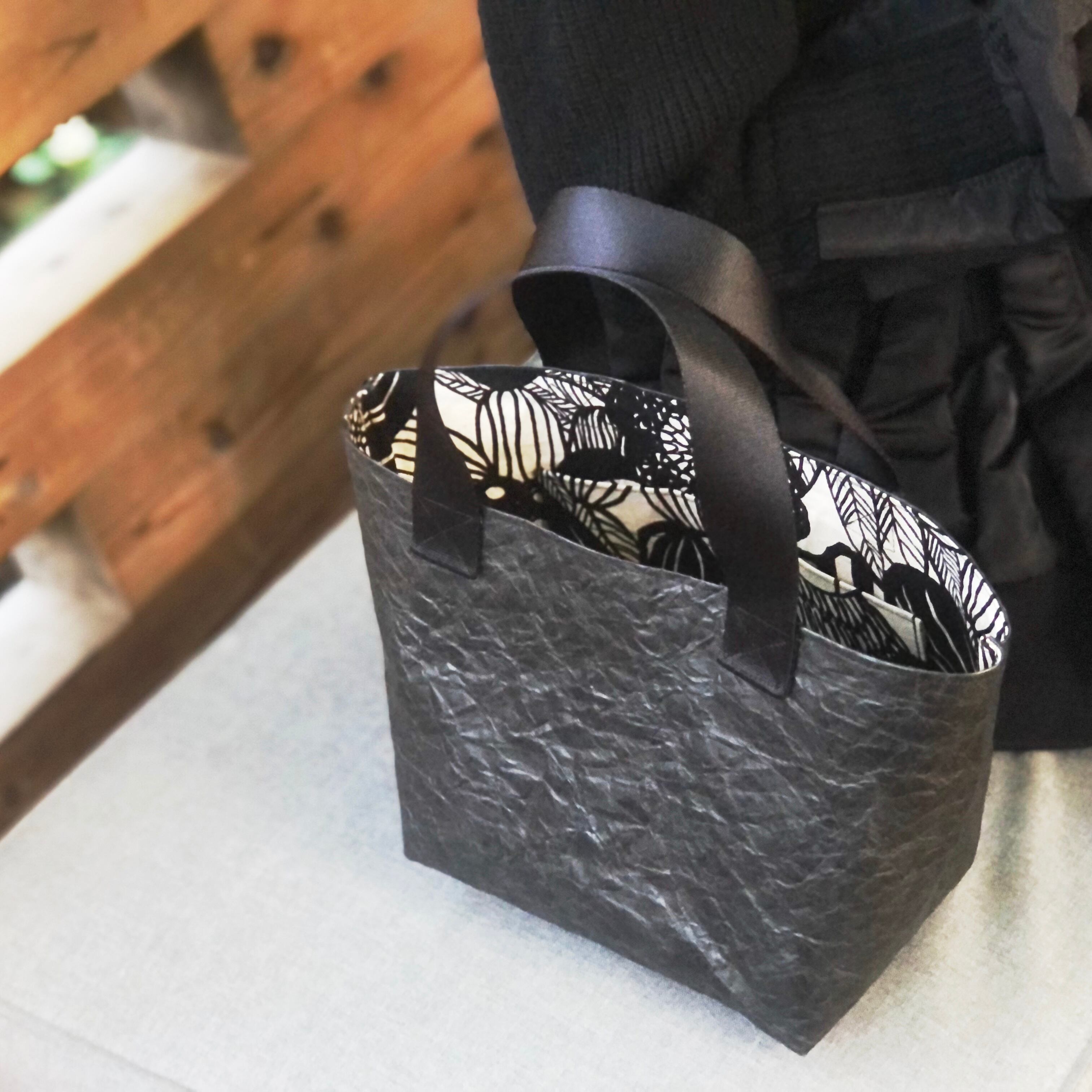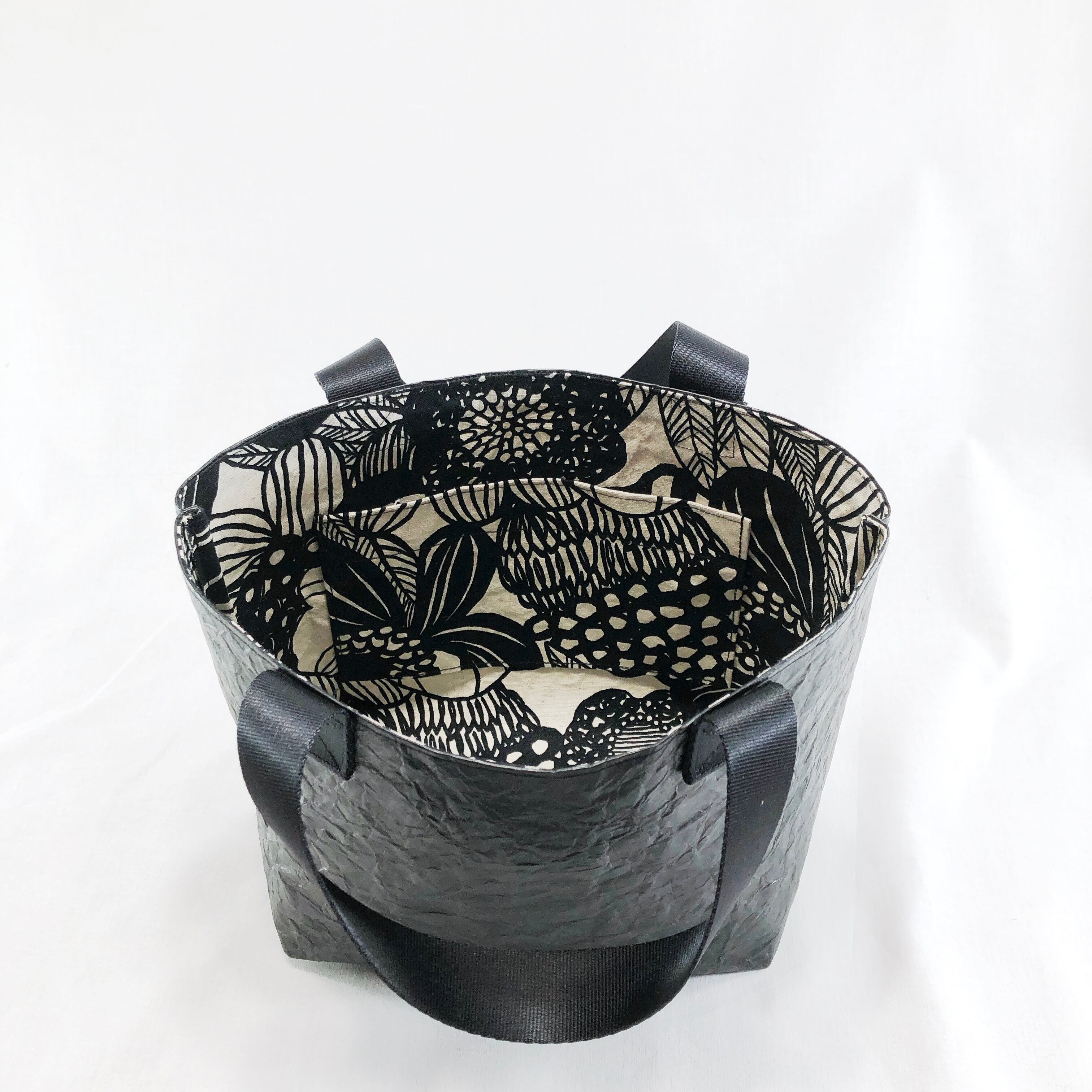 シワ加工したブラックのタイベックにモノトーンボタニカルのコットン生地を張り合わせ、持ち手は朱子織高級ナイロンテープを使用した大人カジュアルなミニトート。とても軽量で毎日使いたくなるバッグです。
