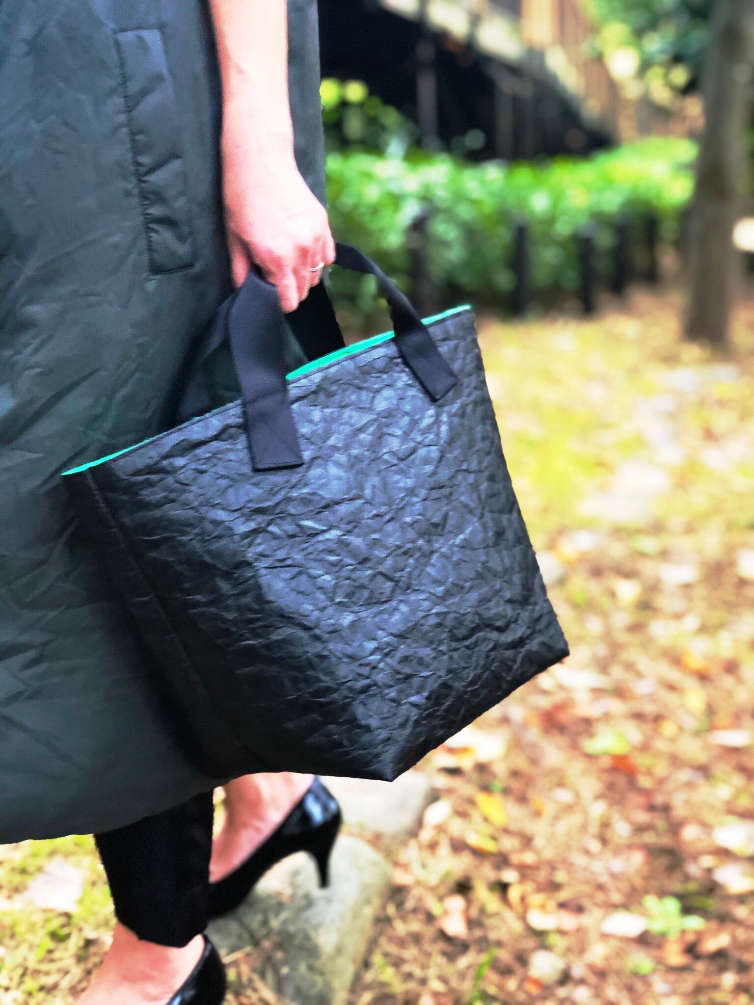 シワ加工したブラックタイベックにビビットなネオングリーンのフェルト調生地を張り合わせ、持ち手は朱子織高級ナイロンテープを使用した遊び心溢れる大人トート。とても軽量で毎日使いたくなるバッグです。