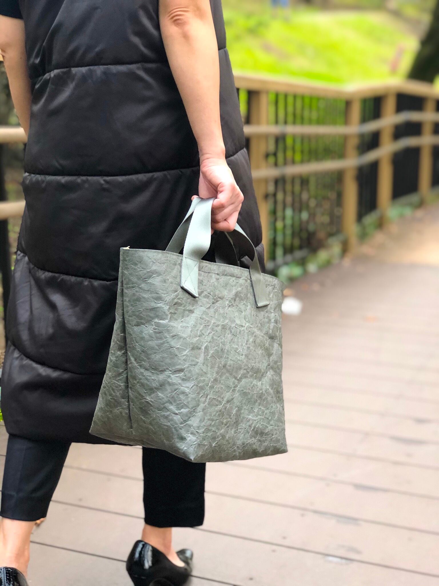 シワ加工したオリーブグレーのタイベックに厚みのあるカーキ(ベージュ)のコットン生地を張り合わせ、持ち手は朱子織高級ナイロンテープを使用したカジュアル過ぎない大人トート。軽量で毎日使いたくなるバッグです。